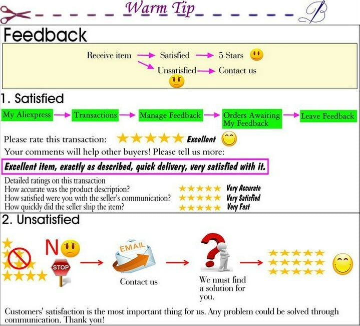 6. If the products you received was damaged or received wrong styles, please dont leave any negative feedbacks first, kindly please contact us asap, we will solve it and work out the best solutions. Your satisfication is our motion to do better.