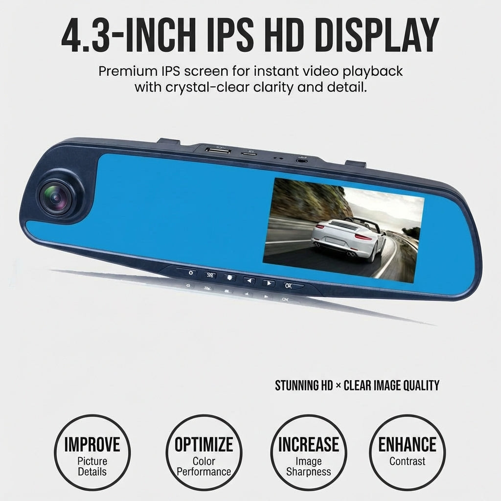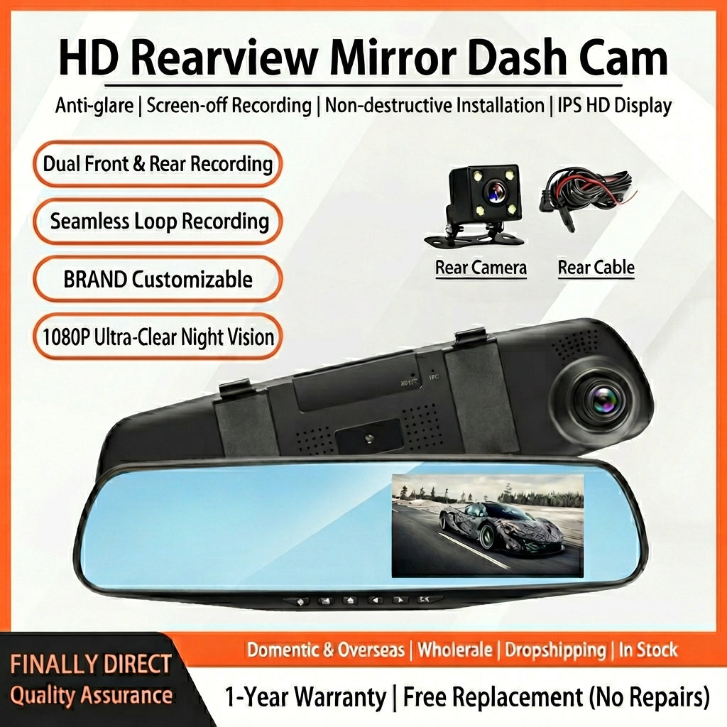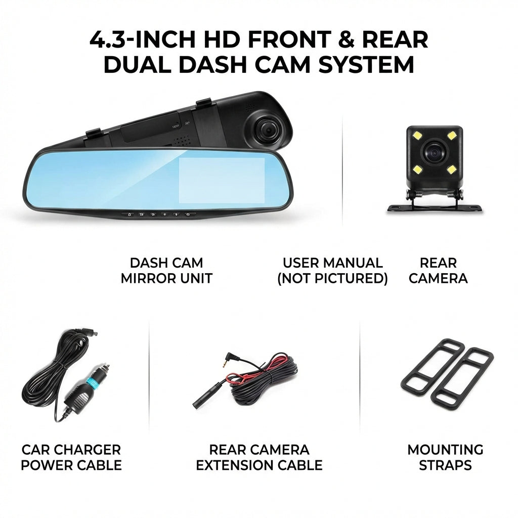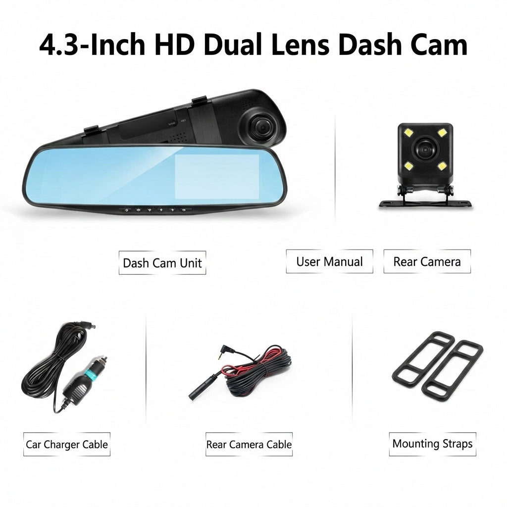Rearview mirror–mounted dual-lens dash cam designed to record both front and rear road views simultaneously