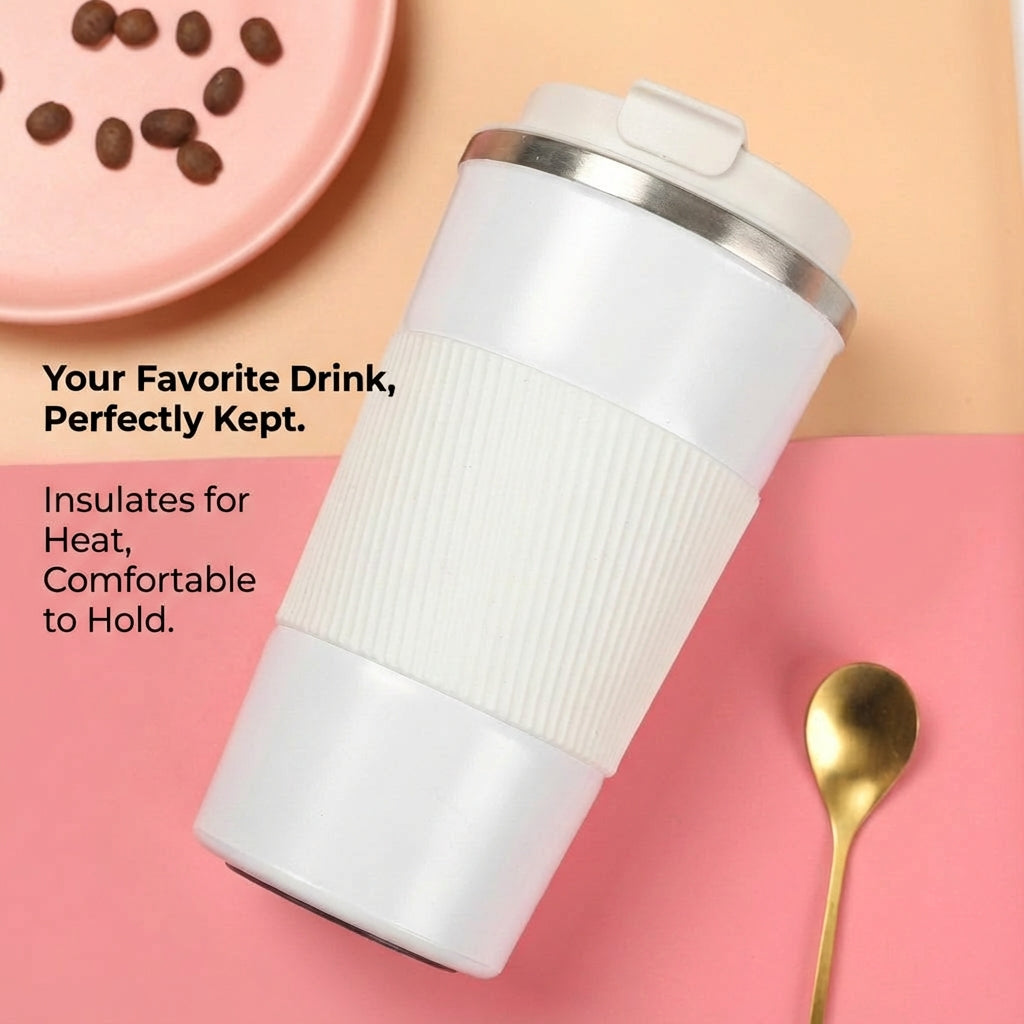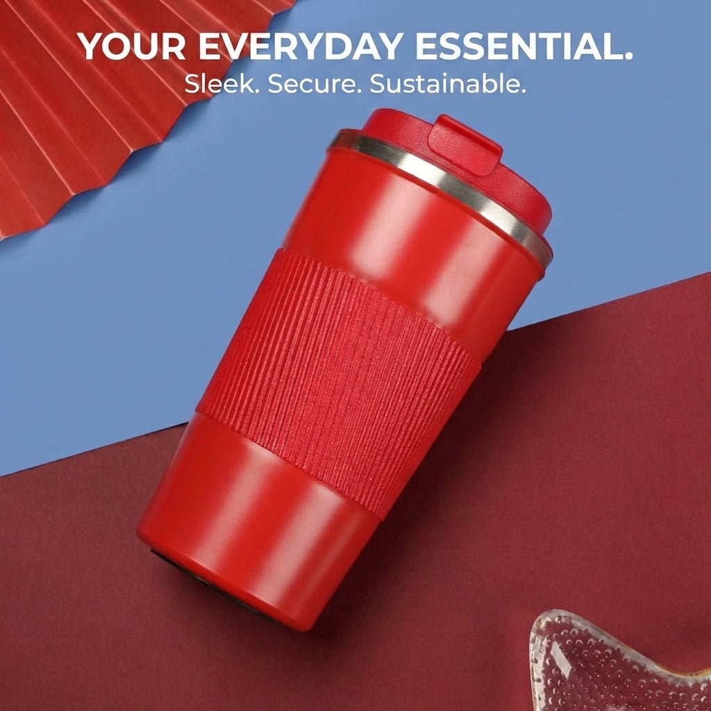 • Premium stainless steel coffee cup with refined leather-style outer sleeve